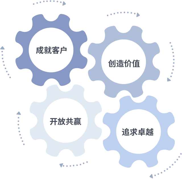 成就客户是一切决策的出发点,,,,创造价值是衡量所有工作的标准,,,追求卓越是我们做事做人的态度,,,,开放共赢是我们的格局也是最终的结果。。。。价值观的齿轮环环相扣,,,推动着组织里的每个人不断向前。。